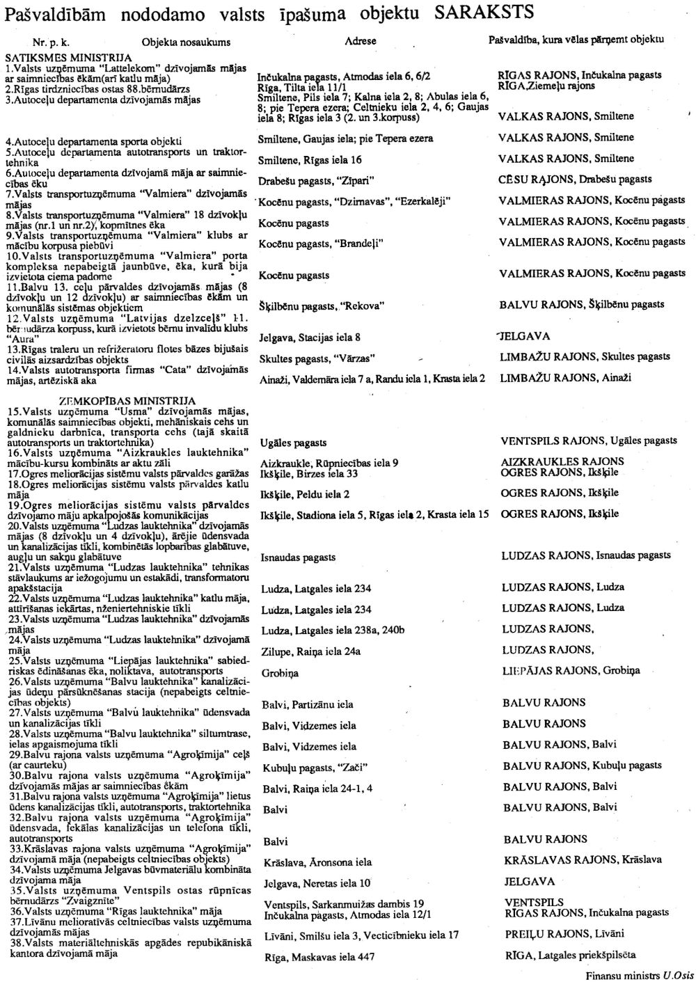 Pamatojoties uz Augstākās Padomes 1991. gada 20. marta lēmuma "Par valsts īpašumu un tā konversijas pamatprincipiem" 4. punktu, kā arī ņemot vērā ministriju un pašvaldību savstarpējo vienošanos, atļaut ministrijām - valsts īpašuma pārvaldītājām - valsts īpašuma objektus nodot attiecīgo pašvaldību īpašumā saskaņā ar pievienoto sarakstu.
