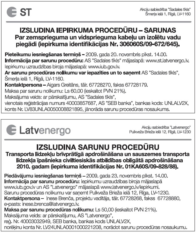 Piegādes un darbu izpildes pasūtījumi. Publicēts oficiālajā laikrakstā "Latvijas Vēstnesis", 15.10.2009., Nr. 164 https://www.vestnesis.lv/ta/id/199152