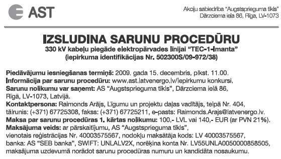 Piedāvājumu iesniegšanas termiņš: 2009.gada 26.novembris plkst.12.