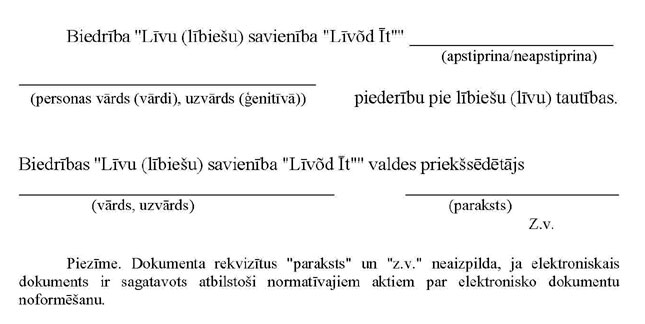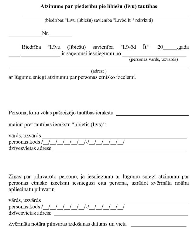 Ministru kabineta 2009. gada 3. novembra noteikumi Nr. 1270 "Noteikumi par atbildīgo lībiešu (līvu) organizāciju atzinuma sniegšanai par personas etnisko izcelsmi". Publicēts oficiālajā laikrakstā "Latvijas Vēstnesis", 10.11.2009., Nr. 178 https://www.vestnesis.lv/ta/id/200335-noteikumi-par-atbildigo-libiesu-livu-organizaciju-atzinuma-sniegsanai-par-personas-etnisko-izcelsmi