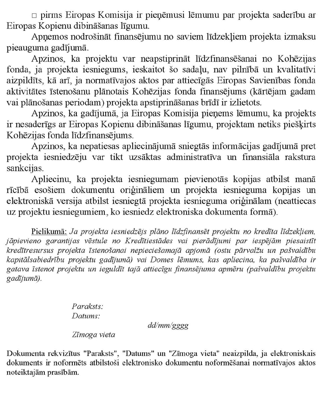 “29.28. projekts nav kvalificējams kā komercdarbības atbalsts vai, ja ir kvalificējams kā komercdarbības atbalsts, projekta iesniegumam ir pievienots apliecinājums, ka projekta iesniedzējs komercdarbības atbalsta kontroli reglamentējošajos normatīvajos aktos noteiktajā kārtībā iesniegs projekta iesniegumu Eiropas Komisijā lēmuma pieņemšanai par projekta saderību ar Eiropas Kopienas dibināšanas līgumu un neuzsāks projekta īstenošanu pirms atbildīgās iestādes lēmuma pieņemšanas par projekta iesnieguma apstiprināšanu vai pirms Eiropas Komisija ir pieņēmusi lēmumu par projekta saderību ar Eiropas Kopienas dibināšanas līgumu.”