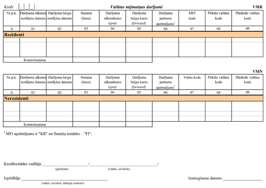 10. Pārskata pozīcijā "MFI kods" norāda darījumā iesaistītā rezidenta MFI trīsciparu lokālās klasifikācijas kodu saskaņā ar "Latvijas Republikas monetāro finanšu iestāžu sarakstu". Pozīcija "MFI kods" nav jāaizpilda, ja darījuma partneris ir finanšu iestāde.