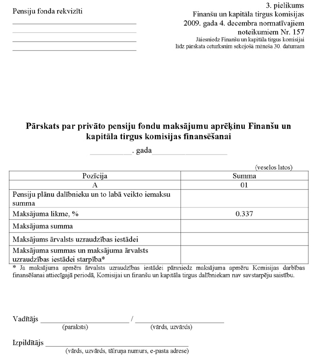 6.3. privātajiem pensiju fondiem "Pārskats par privāto pensiju fondu maksājumu aprēķinu Finanšu un kapitāla tirgus komisijas finansēšanai" (3.pielikums);
