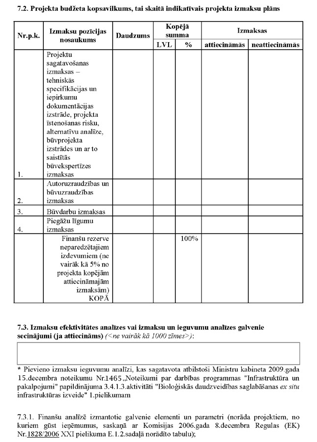 7.1. projektu sagatavošanas izmaksas (tehniskās specifikācijas un iepirkumu dokumentācijas izstrāde, projekta īstenošanas risku un alternatīvu analīze, būvprojekta izstrādes un ar to saistītās būvekspertīzes izmaksas) – līdz pieciem procentiem no projektā plānotajām kopējām attiecināmajām izmaksām;