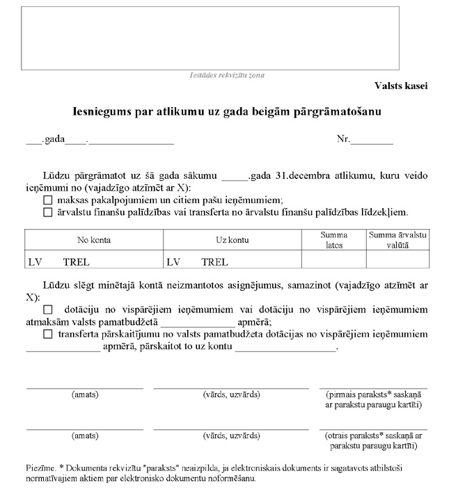 30. Ja budžeta izpildītājiem valsts pamatbudžeta kontos iepriekšējā gada beigās saglabājies līdzekļu atlikums no maksas pakalpojumiem un citiem pašu ieņēmumiem vai ārvalstu finanšu palīdzības, tai skaitā transfertiem no ārvalstu finanšu palīdzības līdzekļiem, Valsts kase, pamatojoties uz budžeta izpildītāja iesniegumu (3.pielikums), līdzekļu atlikumus līdz nākamā saimnieciskā gada 10.janvārim ieskaita: