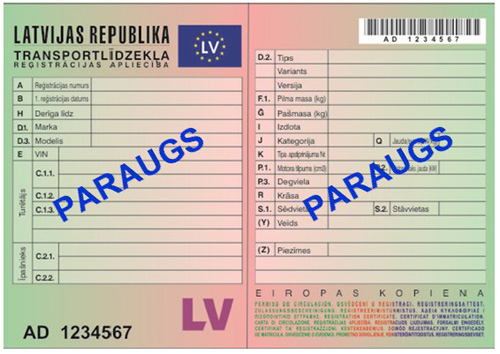 4.1. transportlīdzekļa reģistrācijas apliecību (turpmāk – reģistrācijas apliecība), kas ielaminēta hologrāfiskos pretviltošanas vāciņos (1.pielikums);