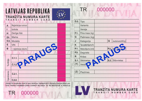 13.1. tranzīta numura zīmes. Tās izsniedz transportlīdzeklim, kuru paredzēts izvest no Latvijas atsavināšanai vai pastāvīgai ekspluatācijai ārvalstī, vai transportlīdzeklim, kurš piedalās ceļu satiksmē, šķērsojot Latvijas teritoriju tranzītā, ja, iebraucot Latvijā, tam nav derīgu numura zīmju. Tranzīta numura piešķiršanu apliecina kopā ar tranzīta numura zīmēm izsniegta tranzīta numura karte. Tranzīta numura zīmes neizsniedz bezceļu transportlīdzekļiem;
