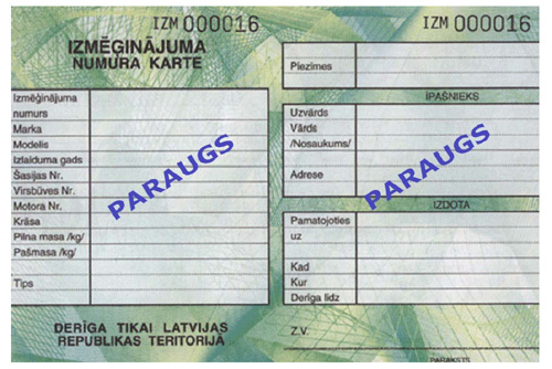 13.3. izmēģinājuma numura zīmes. Tās izsniedz personai, kura izmēģina jaunbūvētos vai pārbūvētos transportlīdzekļus. Izmēģinājuma numura piešķiršanu apliecina kopā ar izmēģinājuma numura zīmēm izsniegta izmēģinājuma numura karte. Izmēģinājuma numura zīmes izsniedz CSDD Transportlīdzekļu reģistrācijas daļā;