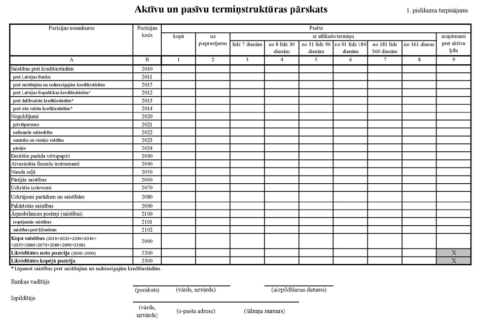 41. Banka "Aktīvu un pasīvu termiņstruktūras pārskatu" sagatavo atbilstoši noteikumu 1. pielikumā noteiktajai veidlapai.