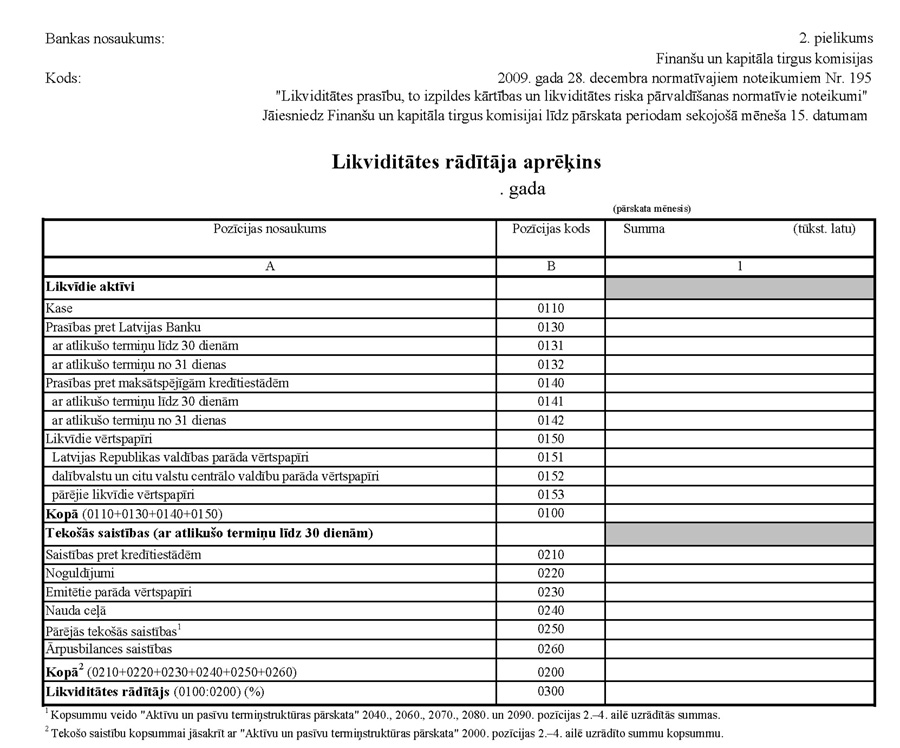 48. Banka "Likviditātes rādītāja aprēķinu" sagatavo atbilstoši noteikumu 2. pielikumā noteiktajai veidlapai.