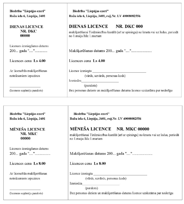 4.3.5. gada licence makšķerēšanai (arī ar spiningu) Liepājas ezerā (izņemot makšķerēšanu no laivas) laika posmā no 16.marta līdz 30.aprīlim – cena Ls 12 (divpadsmit lati);
