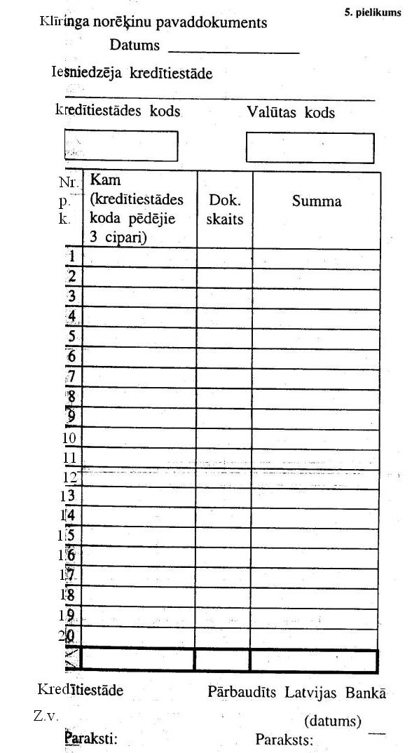 3.3.4. Kredītiestāde sagatavo klīringa norēķinu pavaddokumentu (5.pielikums) divos eksemplāros atsevišķi katras valūtas maksājuma dokumentiem.