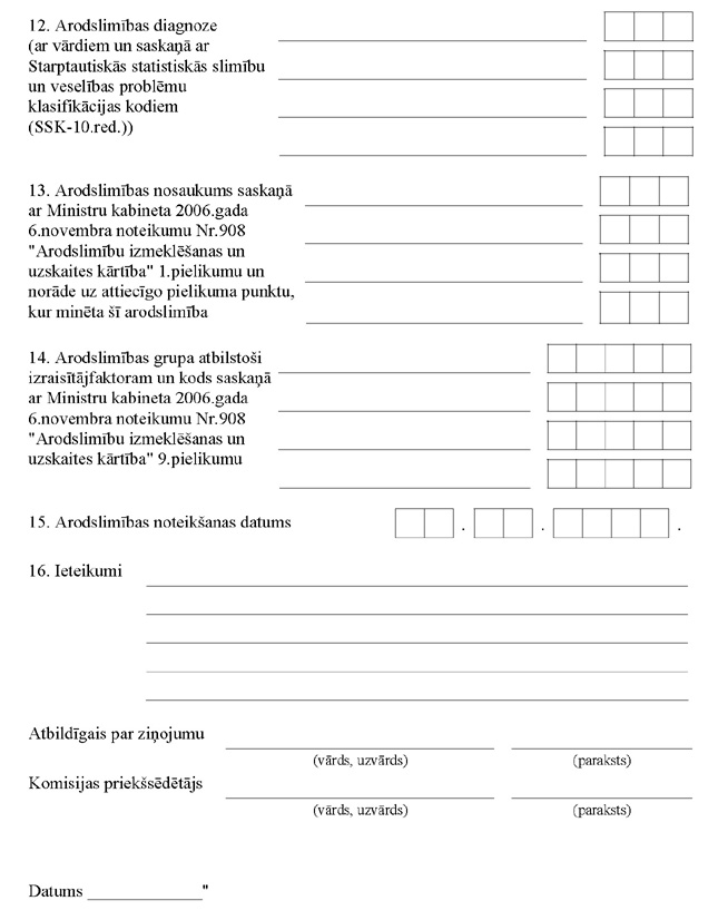 "12. Lēmumu par arodslimības diagnozi pieņem ārstu komisija vai centra ārstu komisija. Komisijas sastāvā ir divi arodslimību ārsti vai arodslimību ārsts un vecākais darba aizsardzības speciālists ar medicīnisko izglītību, neirologs un citi speciālisti, ja nepieciešams. Komisijas priekšsēdētājs ir arodslimību ārsts. Tiesības piedalīties lēmuma pieņemšanā ir arī Valsts sociālās apdrošināšanas aģentūras un Valsts darba inspekcijas pārstāvim.