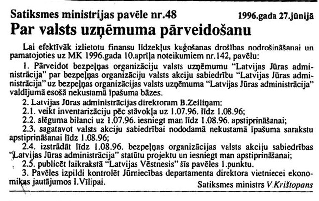 Satiksmes ministrijas 1996. gada 27. jūnija pavēle Nr. 48 "Par valsts uzņēmuma pārveidošanu". Publicēts oficiālajā laikrakstā "Latvijas Vēstnesis", 2.07.1996., Nr. 111 https://www.vestnesis.lv/ta/id/204568