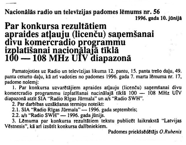 Par konkursa rezultātiem apraides atļauju (licenču) saņemšanai divu komercradio programmu izplatīšanai nacionālajā tīklā 100 - 108 MHz UĪV diapazonā. Publicēts oficiālajā laikrakstā "Latvijas Vēstnesis", 5.07.1996., Nr. 115 https://www.vestnesis.lv/ta/id/204575