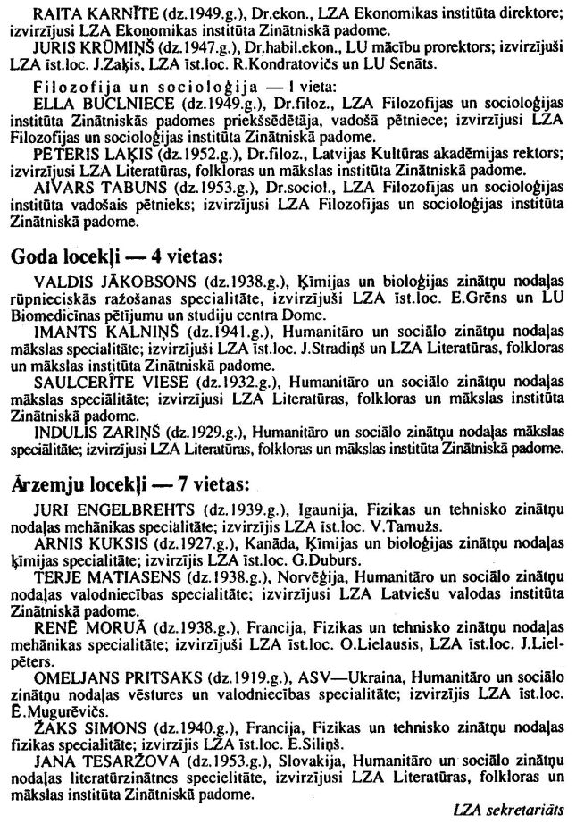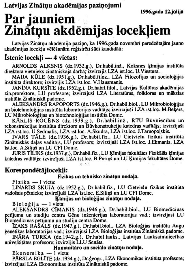 Par jauniem Zinātņu akadēmijas locekļiem. Publicēts oficiālajā laikrakstā "Latvijas Vēstnesis", 19.07.1996., Nr. 122 https://www.vestnesis.lv/ta/id/204744-par-jauniem-zinatnu-akademijas-locekliem