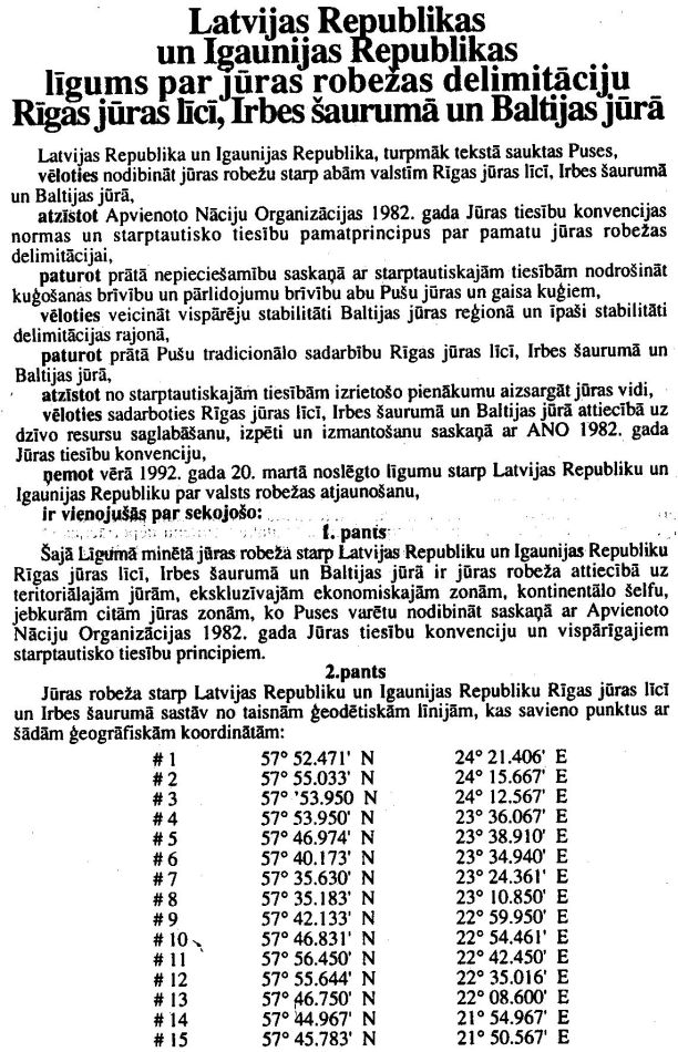 Latvijas Republikas un Igaunijas Republikas līgums par jūras robežas delimitāciju Rīgas jūras līcī, Irbes šaurumā un Baltijas jūrā. Publicēts oficiālajā laikrakstā "Latvijas Vēstnesis", 16.07.1996., Nr. 120 https://www.vestnesis.lv/ta/id/204745