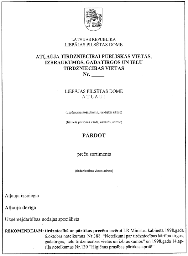 5. Tirdzniecības atļauju (1.pielikums) izsniedz LIEPĀJAS PILSĒTAS DOMES EKONOMI-KAS DAĻAS UZŅĒMĒJDARBĪBAS NODAĻA (turpmāk - UZŅĒMĒJDARBĪBAS NODAĻA) saskaņā ar spēkā esošajiem normatīvajiem aktiem un šiem NOTEIKUMIEM.