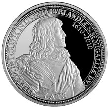 Nominālvērtība: 1 lats; Svars: 31,47 g, diametrs: 38,61 mm; Metāls: 925º sudrabs, kvalitāte: proof; Kalta: 2010.gadā “Koninklijke Nederlandse Munt” (Nīderlande); Mākslinieki: Ilze Lībiete (dizains pēc hercogam Jēkabam veltītas piemiņas medaļas parauga), Ligita Franckeviča un Jānis Strupulis (plastiskais veidojums). |