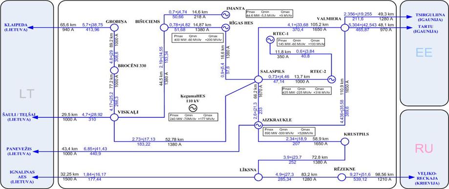 Līniju parametri ir attiecināti pret nominālo spriegumu; Starpvalstu savienojumu parametri ir norādīti līdz Latvijas valsts robežai Ampēros (A) ir norādīta maksimālā pieļaujamā strāva pie ārējās gaisa temperatūras 25oC; Līniju parametri ir norādīti kā |