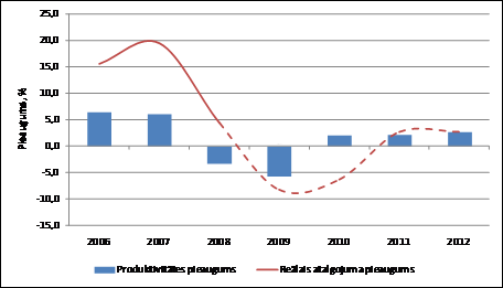Straujais vidējās bruto darba algas pieaugums tautsaimniecībā no 2006.–2008.gadam veicināja iekšējās nesabalansētības rašanos, reālajai darba samaksai pārsniedzot produktivitātes pieauguma tempus, kas tādējādi noteica arī Latvijas tautsaimniecības ārējās konkurētspējas samazināšanos. Sākot ar 2009.gadu, ir vērojama darba ražīguma rādītāju uzlabošanās, ko nosaka saspringtā darba tirgus situācija. Darba samaksas pieauguma tempi faktiskajās cenās līdz 2011.gadam saglabāsies negatīvi. Jāpiezīmē, ka zināmu iespaidu uz darba spēka izmaksām atstāja iedzīvotāju ienākuma nodokļa sloga palielināšanās (likmes palielināšana un atvieglojumu samazināšana).