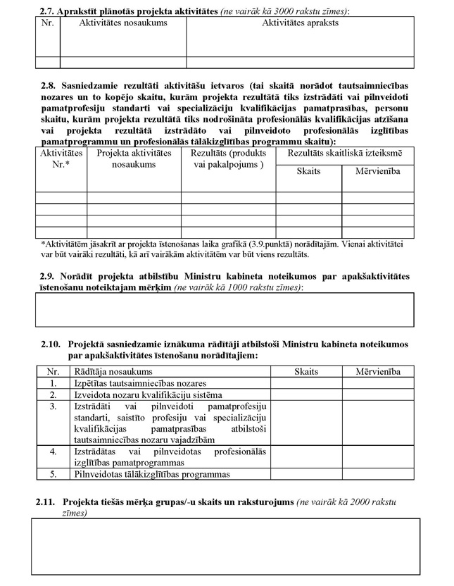 Projektā plānotie rezultāti un to rādītāji veicina vienu vai vairāku šādu apakšaktivitātes iznākuma rādītāju sasniegšanu – 1) veikta tautsaimniecības nozaru izpēte, izveidota nozaru kvalifikāciju sistēma, izstrādāti vai pilnveidoti 80 pamatprofesiju standarti vai specializāciju kvalifikācijas pamatprasības atbilstoši tautsaimniecības nozaru vajadzībām, 2) izstrādātas vai pilnveidotas 20 profesionālās izglītības pamatprogrammas un pilnveidotas 35 tālākizglītības programmas |
