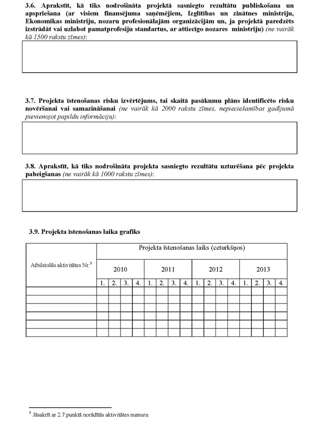 | 3.5.4. projekta rezultātus paredzēts apspriest ar visiem finansējuma saņēmējiem, Izglītības un zinātnes ministriju, Ekonomikas ministriju, nozaru profesionālajām organizācijām un, ja projektā paredzēts izstrādāt vai uzlabot pamatprofesiju standartus, ar attiecīgo nozares ministriju | 3 | |||