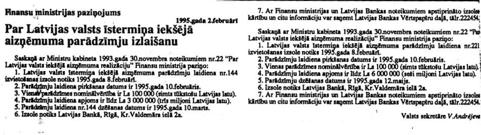 Finanšu ministrijas 1995. gada 2. februāra paziņojums "Par Latvijas valsts īstermiņa iekšējā aizņēmuma parādzīmju izlaišanu". Publicēts oficiālajā laikrakstā "Latvijas Vēstnesis", 3.02.1995., Nr. 18 https://www.vestnesis.lv/ta/id/206450