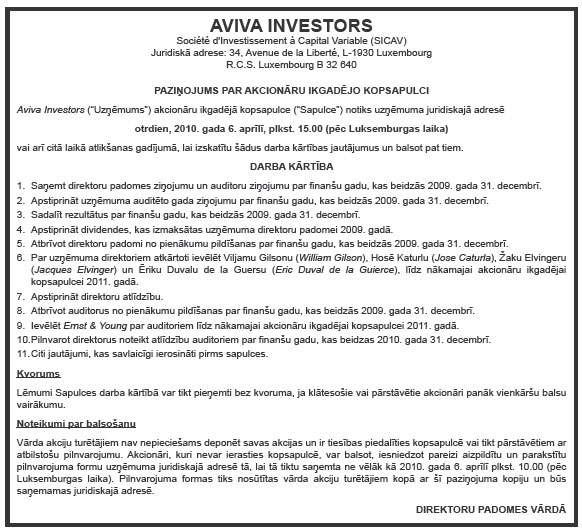 Ieraksta datums, uz kuru tiks fiksēts akcionāru saraksts akcionāru dalībai sapulcē, ir 2010.gada 21.aprīlis. Šajā datumā dienas beigās tiks fiksēti akciju sabiedrības akcionāri un tiem piederošais akciju skaits, kuri būs tiesīgi piedalīties akcionāru sapulcē.
