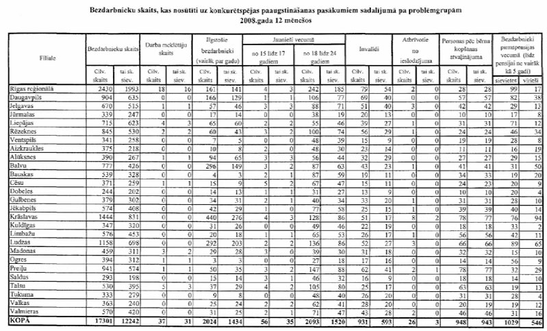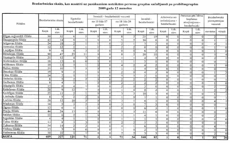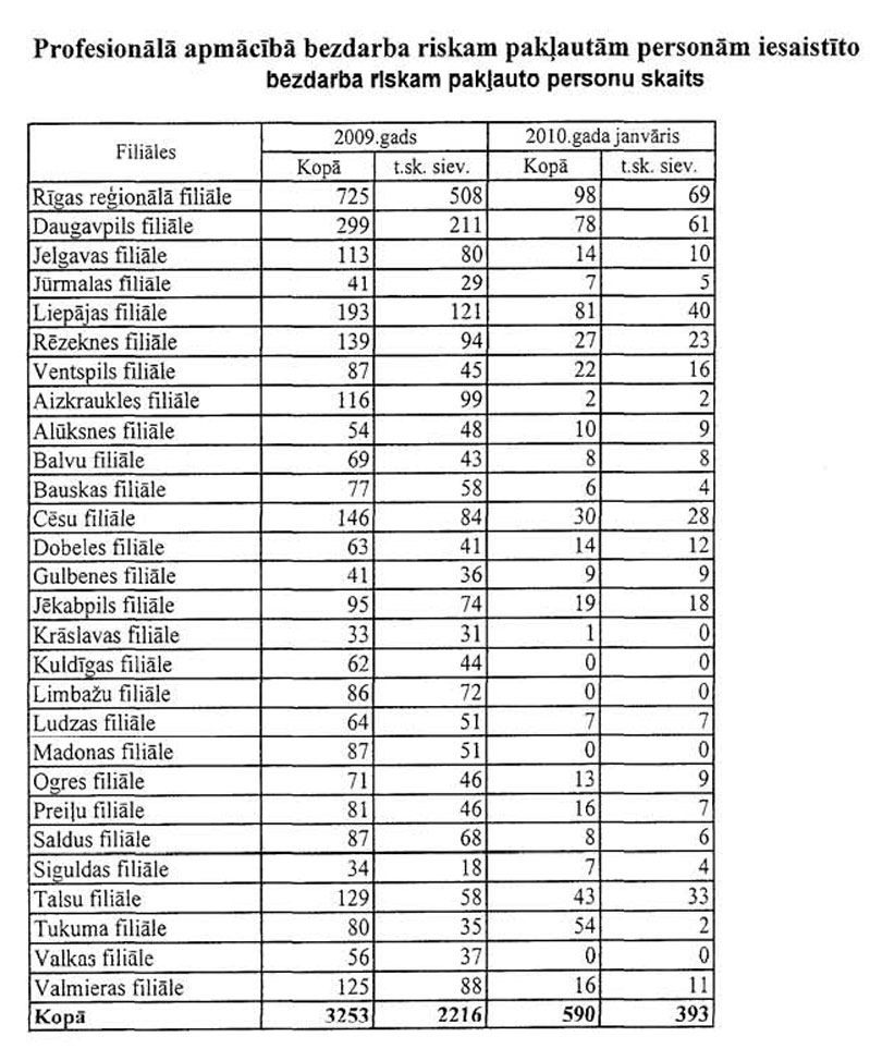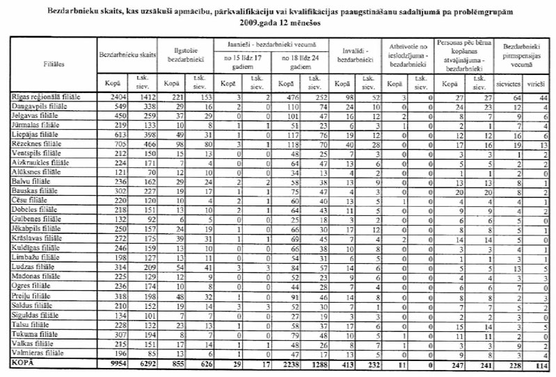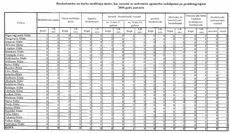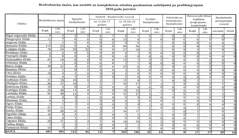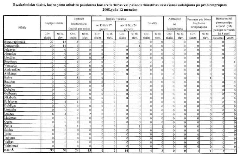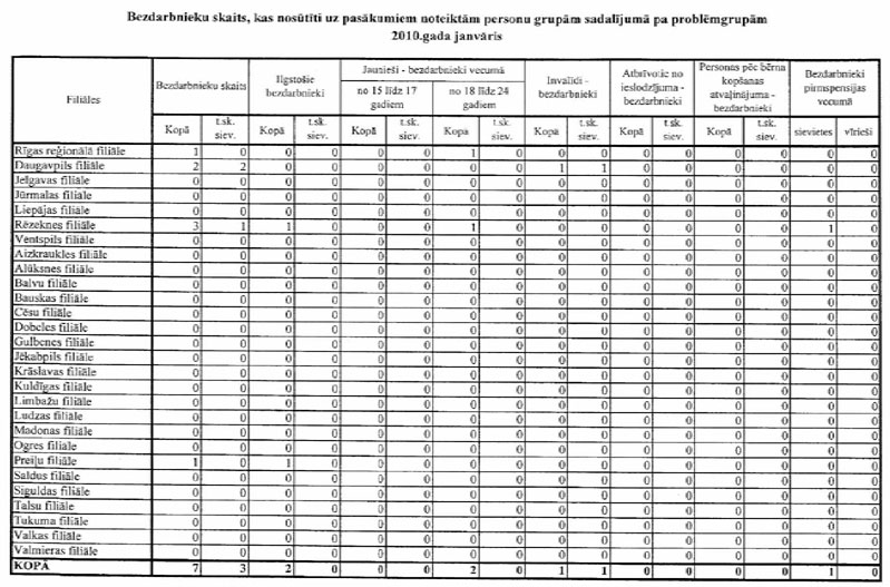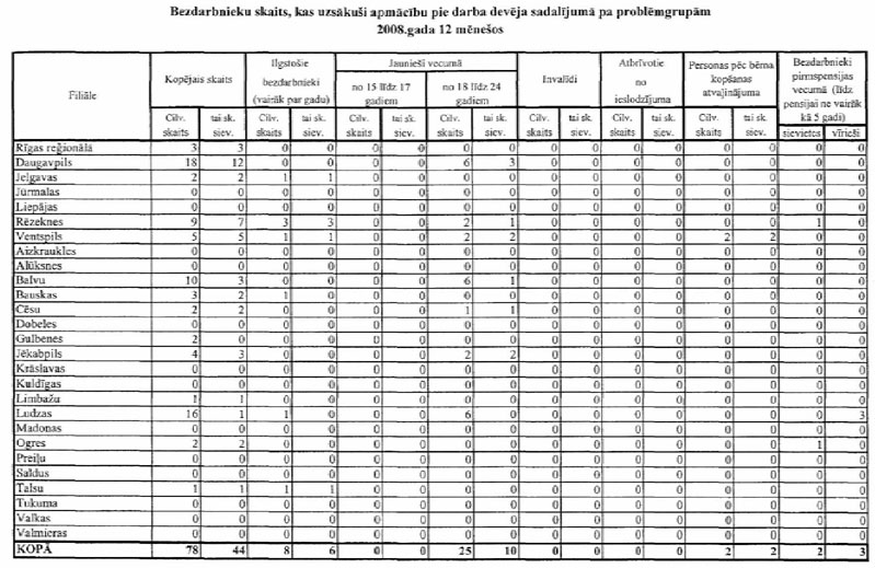 Labklājības ministrija sadarbībā ar Nodarbinātības valsts aģentūru (turpmāk – NVA) ir sagatavojusi informāciju, kuru atbilstoši NVA uzskaites sistēmām ir iespējams sagatavot attiecībā par bezdarbnieku un bezdarba riskam pakļauto personu sadalījumu pēc mērķu grupām un iesaisti aktīvajos nodarbinātības un preventīvajos bezdarba samazināšanas pasākumos. Informējam, ka šobrīd ir iespējams sniegt tikai informāciju par mērķa grupu bezdarbnieku un bezdarba riskam pakļauto personu iesaisti aktīvajos nodarbinātības un preventīvajos bezdarba samazināšanas pasākumos 2008. un 2009.gadā, kā arī atsevišķiem pasākumiem arī 2010.gada janvārī (skatīt 1.pielikumu) un informāciju par katram aktīvajam nodarbinātības un preventīvajam bezdarba samazināšanas pasākumam piešķirto finansējumu (skatīt 2.pielikumu).