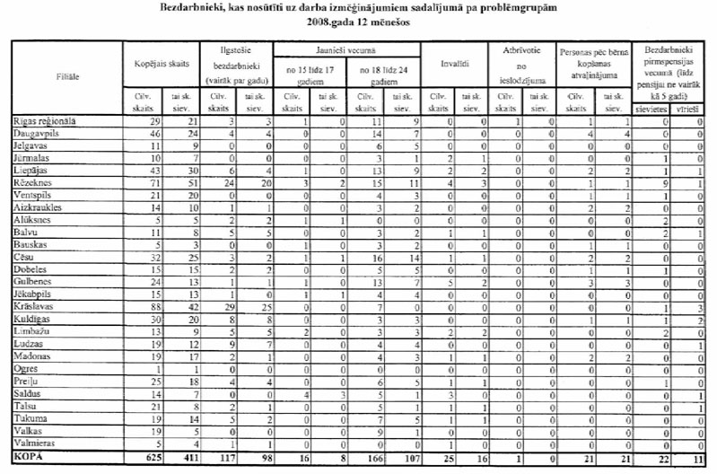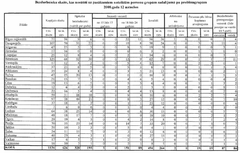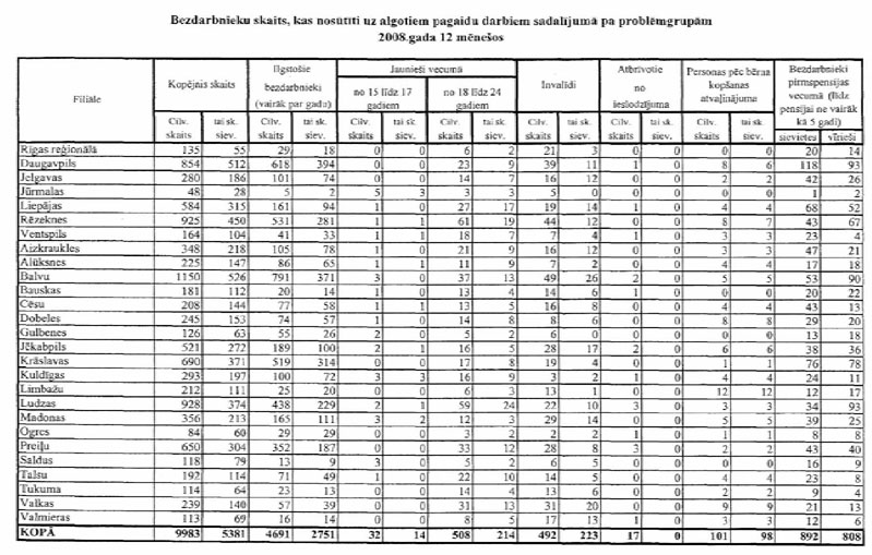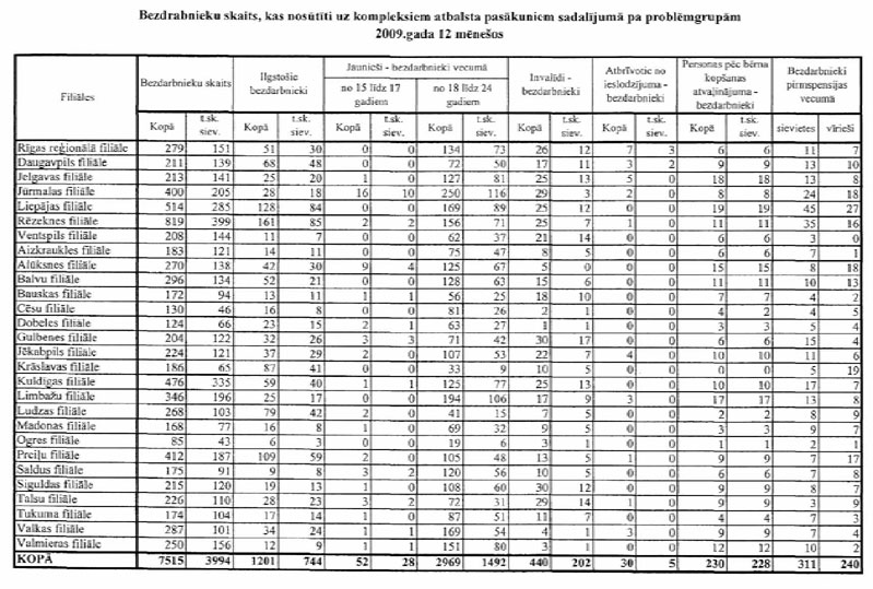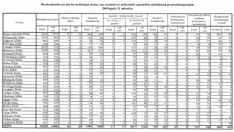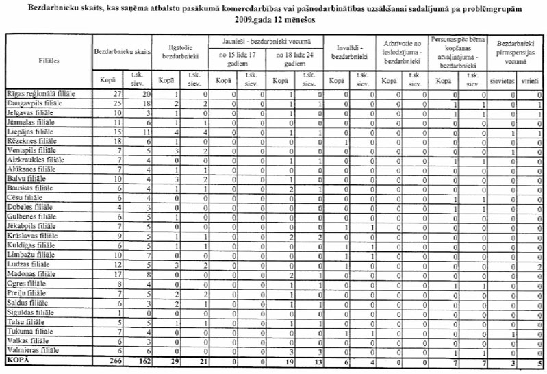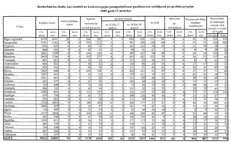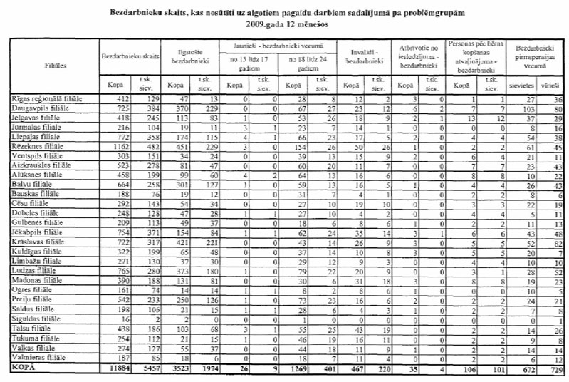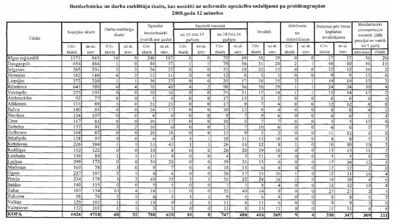 Labklājības ministrija sadarbībā ar Nodarbinātības valsts aģentūru (turpmāk – NVA) ir sagatavojusi informāciju, kuru atbilstoši NVA uzskaites sistēmām ir iespējams sagatavot attiecībā par bezdarbnieku un bezdarba riskam pakļauto personu sadalījumu pēc mērķu grupām un iesaisti aktīvajos nodarbinātības un preventīvajos bezdarba samazināšanas pasākumos. Informējam, ka šobrīd ir iespējams sniegt tikai informāciju par mērķa grupu bezdarbnieku un bezdarba riskam pakļauto personu iesaisti aktīvajos nodarbinātības un preventīvajos bezdarba samazināšanas pasākumos 2008. un 2009.gadā, kā arī atsevišķiem pasākumiem arī 2010.gada janvārī (skatīt 1.pielikumu) un informāciju par katram aktīvajam nodarbinātības un preventīvajam bezdarba samazināšanas pasākumam piešķirto finansējumu (skatīt 2.pielikumu).
