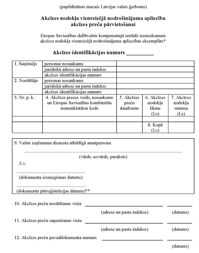 34.4. ja nodrošinājumu ir plānots izmantot akcīzes preču nosūtīšanai vai saņemšanai, – informāciju par akcīzes preču nosūtītāju un saņēmēju (personas nosaukums, juridiskā adrese un pasta indekss, akcīzes identifikācijas numurs), akcīzes preču aprakstu, Eiropas Savienības kombinētās nomenklatūras kodus un informāciju par to, vai vienreizējā nodrošinājuma apliecību ir nepieciešams iesniegt citas Eiropas Savienības dalībvalsts kompetentām iestādēm;