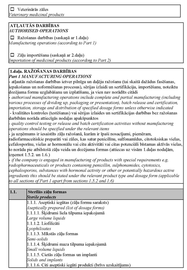 1.3. zāļu vai veterināro zāļu lieltirgotavas, zāļu vai veterināro zāļu, vai pētāmo zāļu ražošanas darbības uzsākšanas un atbilstības novērtēšanas kārtību;