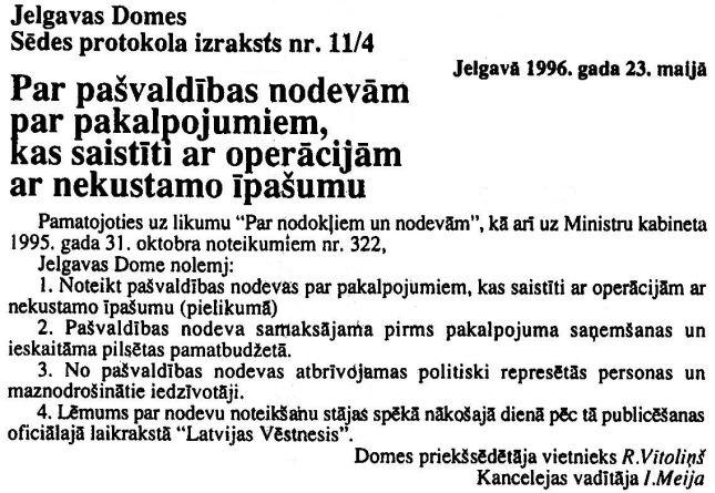 Jelgavas pilsētas domes 1996. gada 23. maija protokola izraksts Nr. 11 "Par pašvaldības nodevām par pakalpojumiem, kas saistīti ar operācijām ar nekustamo īpašumu". Publicēts oficiālajā laikrakstā "Latvijas Vēstnesis", 12.06.1996., Nr. 100/101 https://www.vestnesis.lv/ta/id/207552