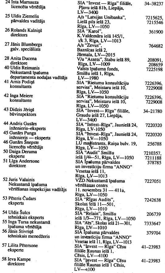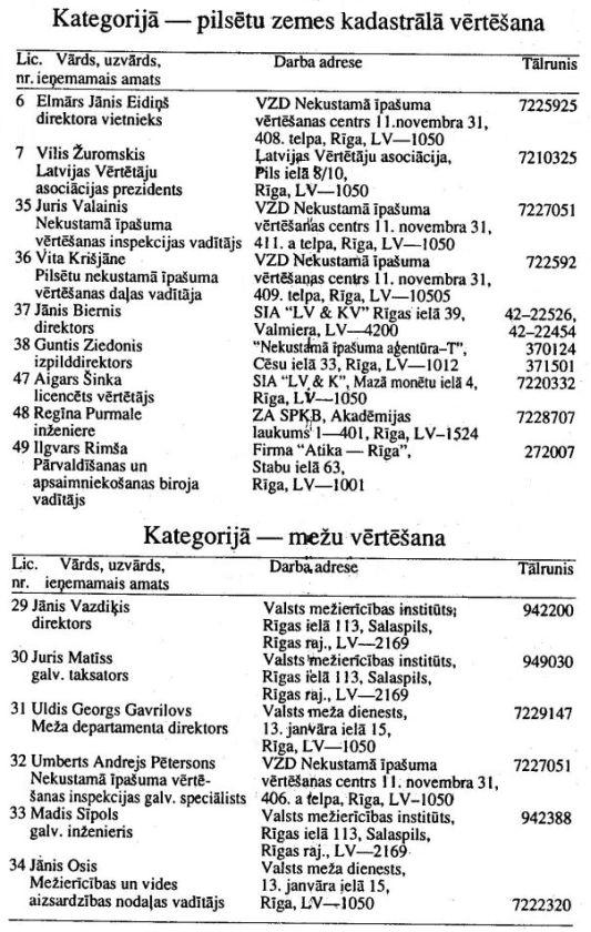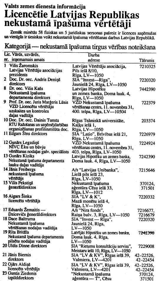 Licencētie Latvijas Republikas nekustamā īpašuma vērtētāji. Publicēts oficiālajā laikrakstā "Latvijas Vēstnesis", 13.06.1996., Nr. 102 https://www.vestnesis.lv/ta/id/207554