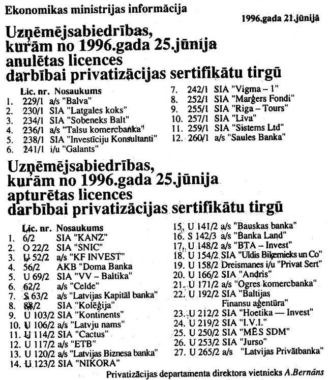 Ekonomikas ministrijas 1996. gada 21. jūnija informācija "Uzņēmējsabiedrības, kurām no 1996.gada 25.jūnija anulētas licences darbībai privatizācijas sertifiķātu tirgū". Publicēts oficiālajā laikrakstā "Latvijas Vēstnesis", 27.06.1996., Nr. 109 https://www.vestnesis.lv/ta/id/207885