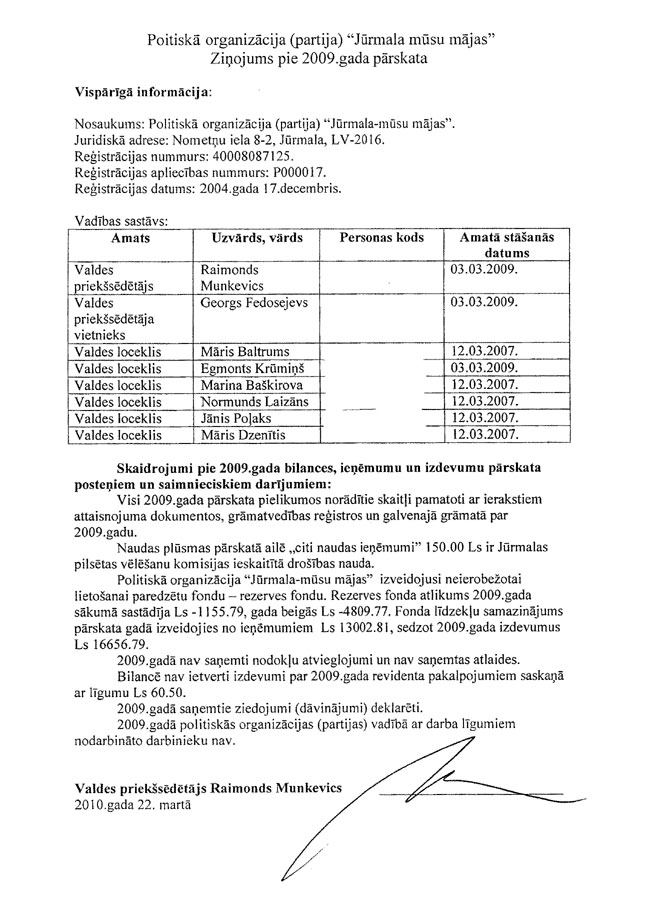 Mēs esam iepazinušies arī ar vadības ziņojumu par 2009.gadu, kas atspoguļots 3.lappusē, un neesam atklājuši būtiskas neatbilstības starp šajā vadības ziņojumā un 2009.gada finanšu pārskatā atspoguļoto finanšu informāciju.