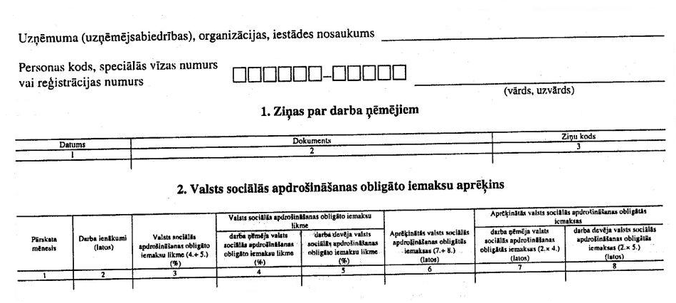 Darba ņēmēja valsts sociālās apdrošināšanas obligāto iemaksu uzskaites kartīte