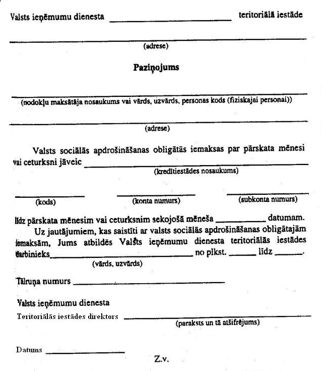 20. Pašnodarbinātais obligātās iemaksas veic Valsts ieņēmumu dienesta teritoriālās iestādes (pēc dzīvesvietas adreses) norādītajā kontā un subkontā līdz pārskata ceturksnim sekojošā mēneša piecpadsmitajam datumam (norādīts paziņojumā). Viens paziņojuma eksemplārs izsniedzams pašnodarbinātajam, otrs glabājams Valsts ieņēmumu dienesta teritoriālajā iestādē.