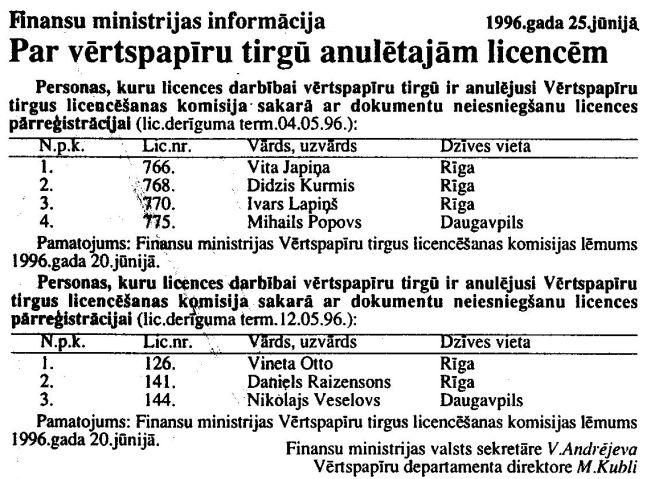 Finanšu ministrijas 1996. gada 25. jūnija informācija "Par vērtspapīru tirgū anulētajām licencēm". Publicēts oficiālajā laikrakstā "Latvijas Vēstnesis", 2.07.1996., Nr. 111 https://www.vestnesis.lv/ta/id/208416