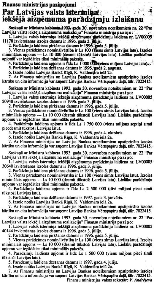 Finanšu ministrijas paziņojums "Par Latvijas valsts īstermiņa iekšējā aizņēmuma parādzīmju izlaišanu". Publicēts oficiālajā laikrakstā "Latvijas Vēstnesis", 2.07.1996., Nr. 111 https://www.vestnesis.lv/ta/id/208418