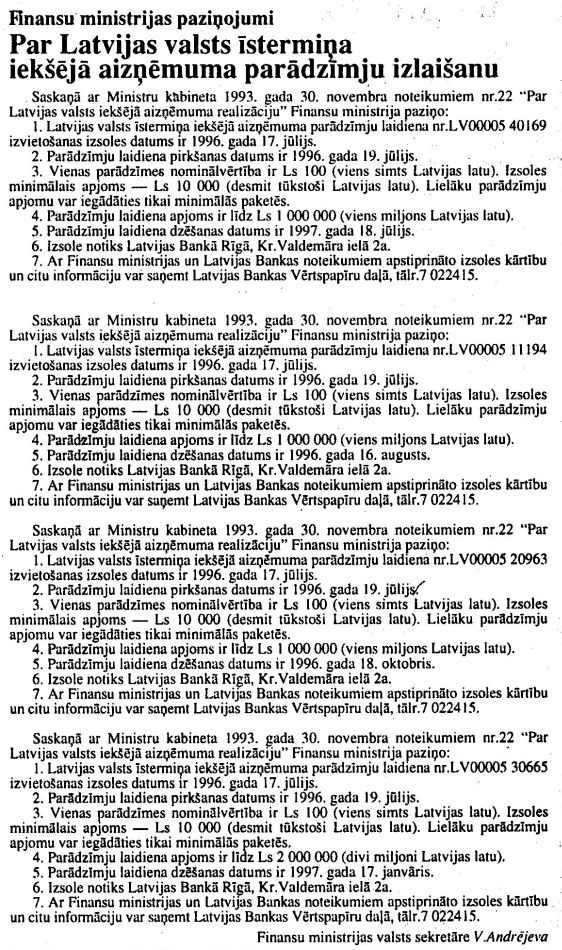 Finanšu ministrijas paziņojums "Par Latvijas valsts īstermiņa iekšējā aizņēmuma parādzīmju izlaišanu". Publicēts oficiālajā laikrakstā "Latvijas Vēstnesis", 16.07.1996., Nr. 120 https://www.vestnesis.lv/ta/id/208434