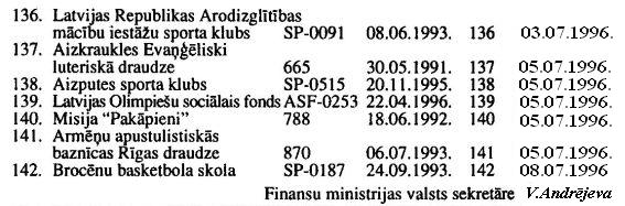Finanšu ministrijas informācija "Par organizācijām, kurām Finansu ministrija ir izsniegusi atļaujas 1996.gadā saņemt ziedojumus, ziedotājiem saņemot uzņēmumu ienākuma nodokļa atlaides saskaņā ar likuma "Par uzņēmumu ienākuma nodokli" 20.pantu". Publicēts oficiālajā laikrakstā "Latvijas Vēstnesis", 19.07.1996., Nr. 122 https://www.vestnesis.lv/ta/id/208437