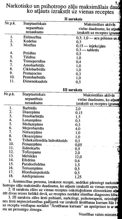 9.Apstiprināt narkotisko un psihotropo zāļu maksimālo daudzumu, ko drīkst izrakstīt uz vienas receptes (7.pielikums).