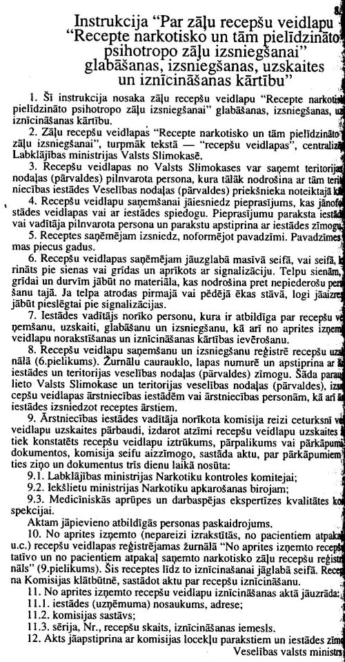 13. Noteikt, ka līdz š.g. 20.septembrim vecā parauga neizlietoto recepšu veidlapu "Speciālā recepšu veidlapa narkotisko ārstniecības līdzekļu izsniegšanai" krājumi ārstniecības iestādēs jāiznīcina saskaņā ar instrukciju "Par zāļu recepšu veidlapu "Recepte narkotisko un tām pielīdzināto psihotropo zāļu izsniegšanai", glabāšanas, izsniegšanas, uzskaites un iznīcināšanas kārtību". Par veidlapu iznīcināšanu jāsastāda akts, kura kopija trīs dienu laikā jānosūta Labklājības ministrijas Narkotiku kontroles komitejai.