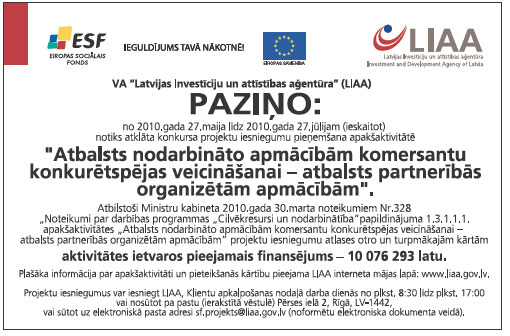 Projektu iesniegumus pieņems no 2010.gada 28.maija līdz 2010.gada 28.jūnijam.