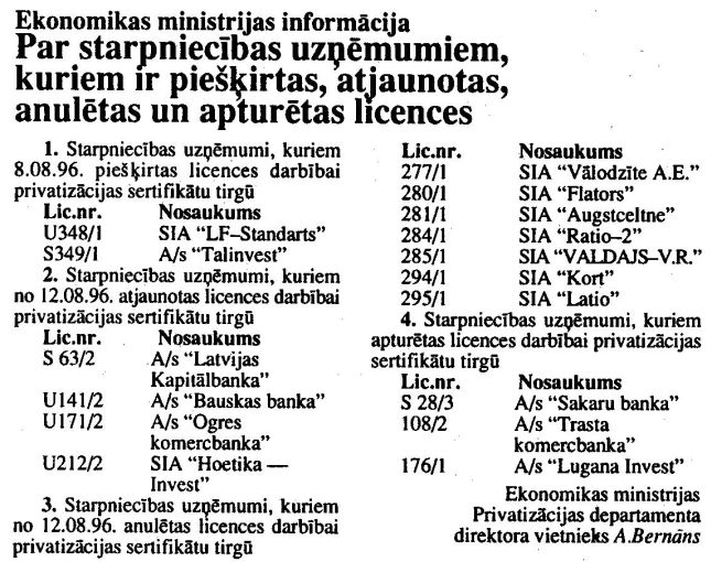 Ekonomikas ministrijas informācija "Par starpniecības uzņēmumiem, kuriem ir piešķirtas, atjaunotas, anulētas un apturētas licences". Publicēts oficiālajā laikrakstā "Latvijas Vēstnesis", 14.08.1996., Nr. 136 https://www.vestnesis.lv/ta/id/209036