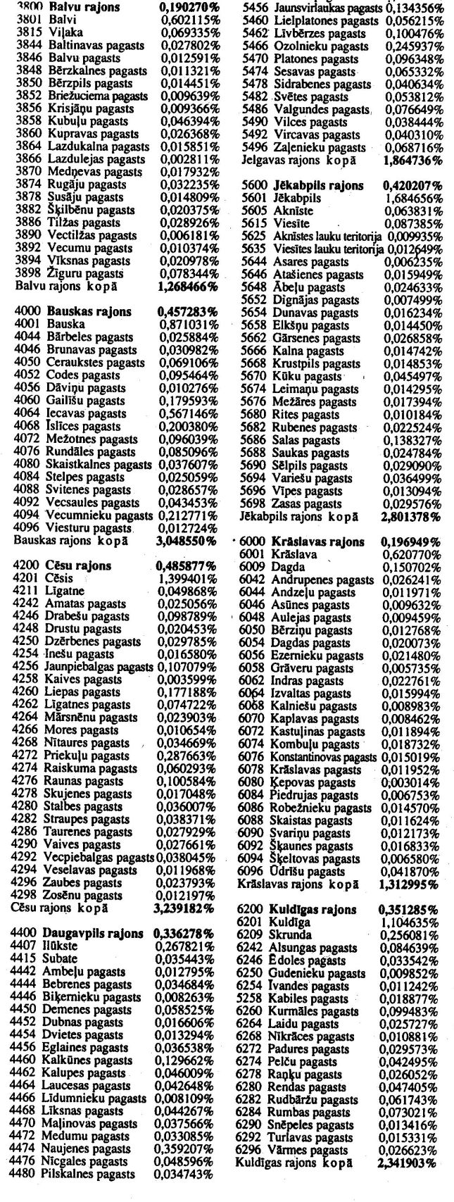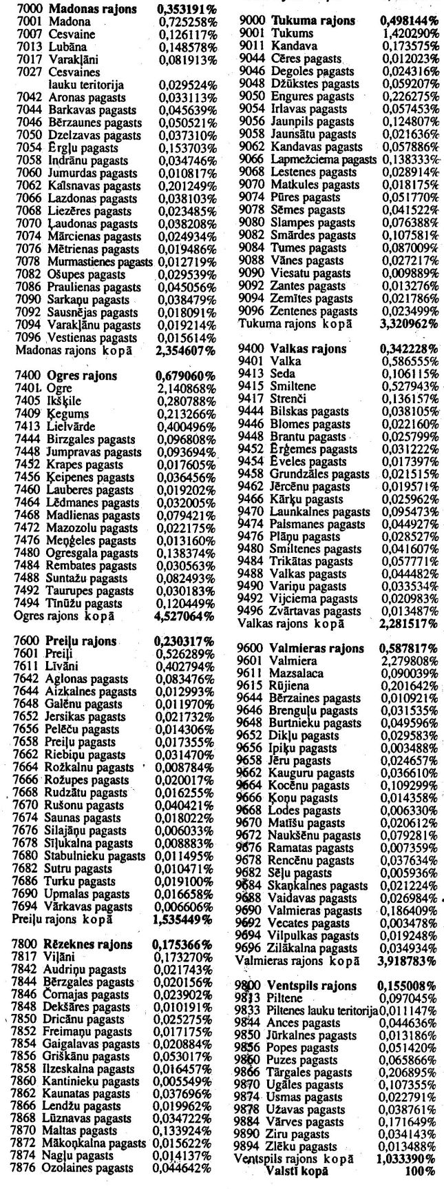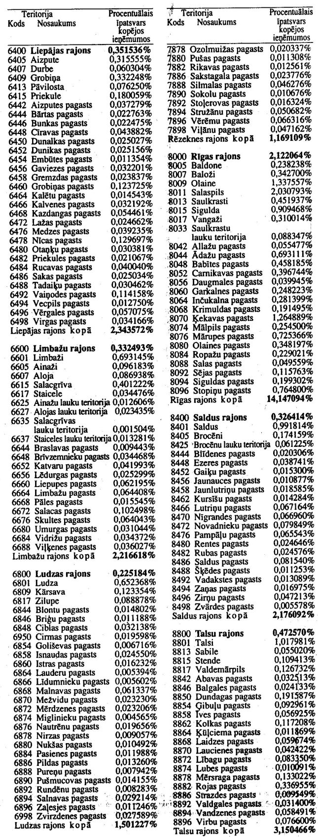 Ekonomikas ministrijas 1996. gada 1. augusta rīkojums Nr. 452 "Par pašvaldību procentuālā īpatsvara koeficientiem". Publicēts oficiālajā laikrakstā "Latvijas Vēstnesis", 15.08.1996., Nr. 137 https://www.vestnesis.lv/ta/id/209038