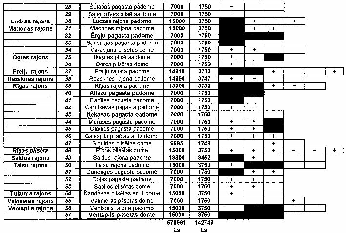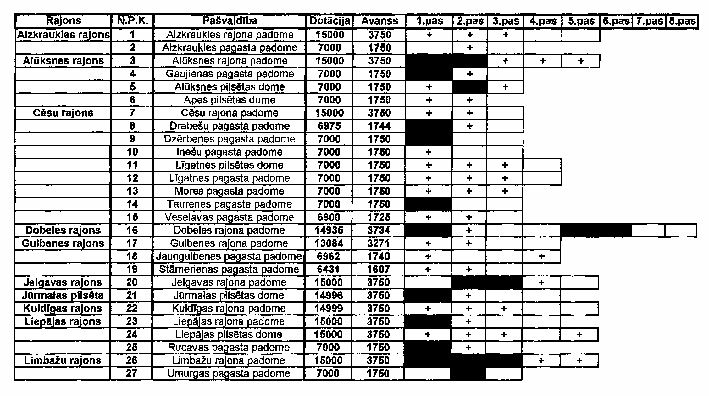 Savukārt vismaz vienu pasākumu bija pabeigušas 35 pašvaldības, t.i., 61%. 18 pašvaldības, t.i., 32% — izlietojušas visu izmaksāto mērķdotācijas avansu, bet nevienu pasākumu nebija pabeigušas. Vienā pašvaldībā — Ķekavas pagastā — dotējamais pasākums vispār nebija uzsākts. Var secināt, ka no 208 finansējamiem pasākumiem pilnībā tika pabeigti 42 jeb 22% pasākumu, par kuriem ir izmaksāta mērķdotācijas daļa Ls 110 092 apjomā.
