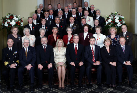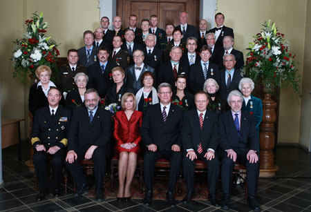 Otrdien, 4.maijā, Latvijas Republikas Neatkarības deklarācijas pasludināšanas 20.gadadienas vakarā, pulksten 18 Rīgas pils Ģerboņu zālē notika Latvijas valsts apbalvojumu – Triju Zvaigžņu ordeņa, Viestura ordeņa un Atzinības krusta – pasniegšanas ceremonija. Valsts apbalvojumi apbalvotajiem tika pasniegti trīs svinīgajās ceremonijās Rīgas pilī – 1., 3. un 4.maijā. Šeit attēlā: (pirmajā rindā) Ordeņu kapitula locekļi Gaidis Andrejs Zeibots un Ojārs Ēriks Kalniņš, Ordeņu kapitula kanclers Andris Vilks, Valsts prezidenta kundze Lilita Zatlere, Valsts prezidents Valdis Zatlers, Ministru prezidents Valdis Dombrovskis, Ordeņu kapitula locekļi Dace Gardovska un Juris Binde kopā ar apbalvotajiem Foto: VPK |